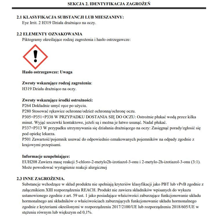 Konserwanty: methylchloroisothiazolinone, methylisothiazolinone, 2-bromo-2-nitropropane-1,3-diol