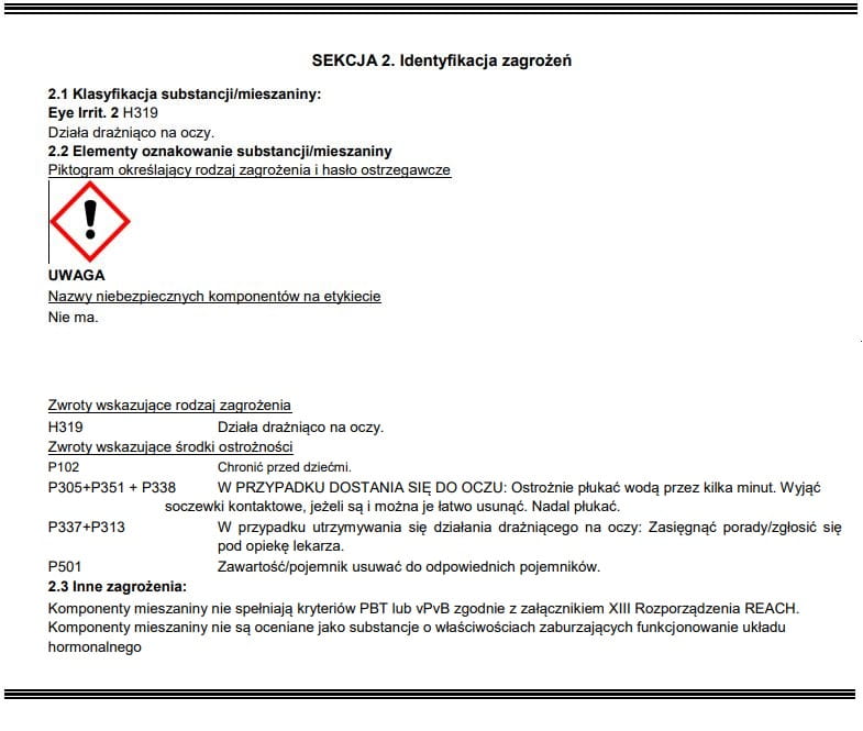 Przed użyciem zapoznać się z kartą charakterystyki produktu. Unikać kontaktu z oczami i skórą. W przypadku kontaktu, przemyć obficie wodą.